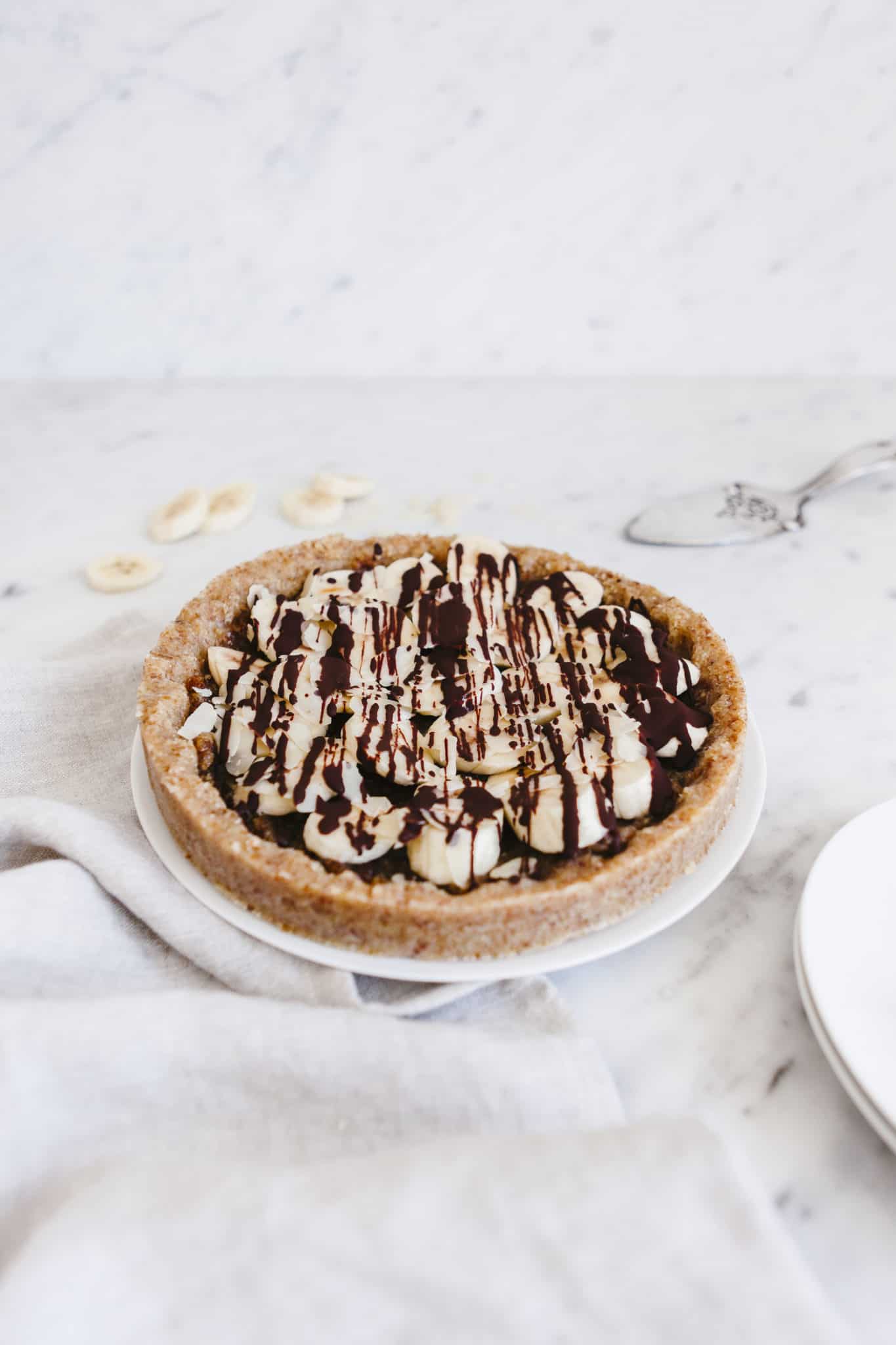 Deze lekkere vegan bananentaart heeft een bodem van amandelen. De taart wordt afgewerkt met karamel en chocolade. Echt genieten dus!