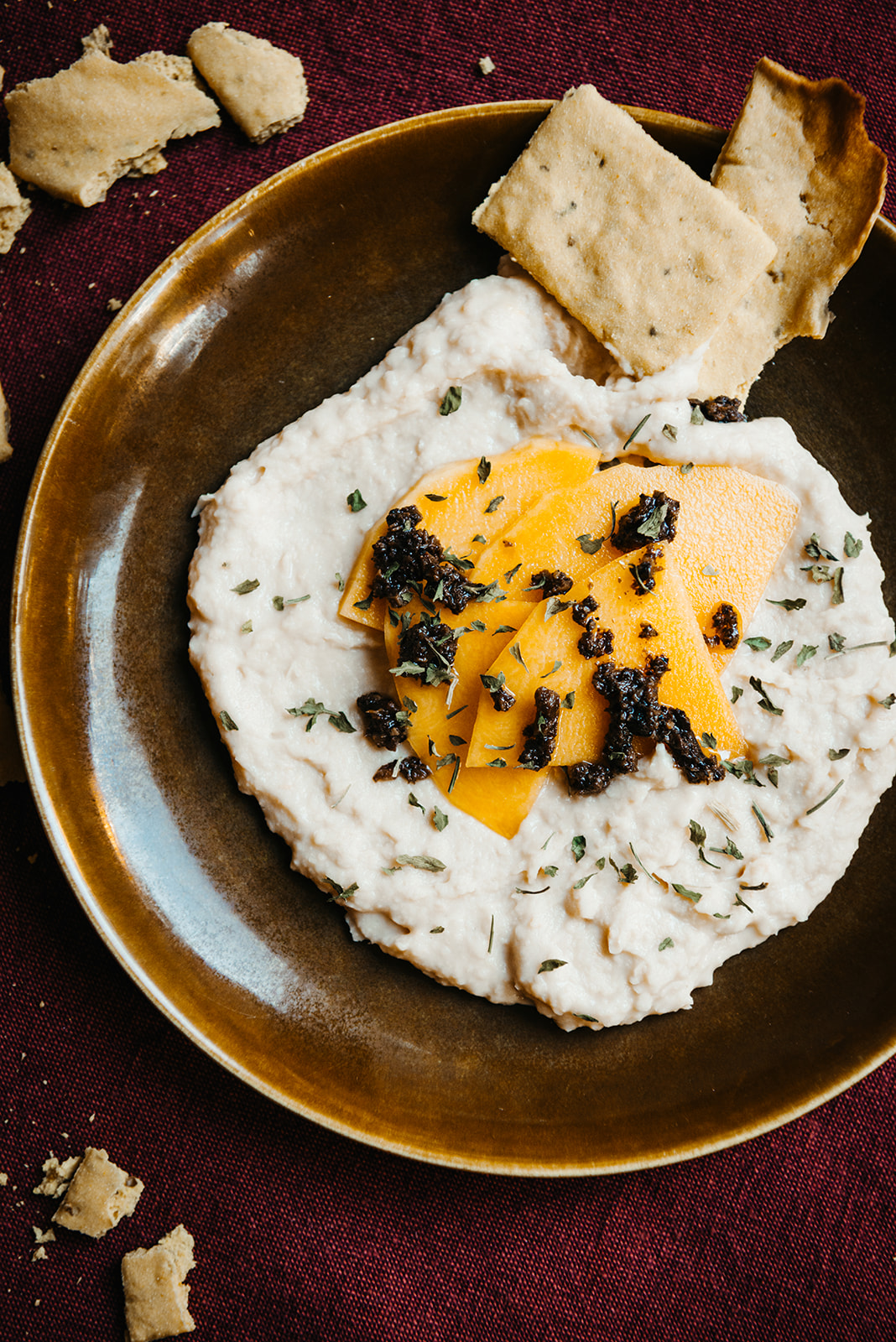 Crème van cannellinibonen met miso, opgelegde pompoen en truffel