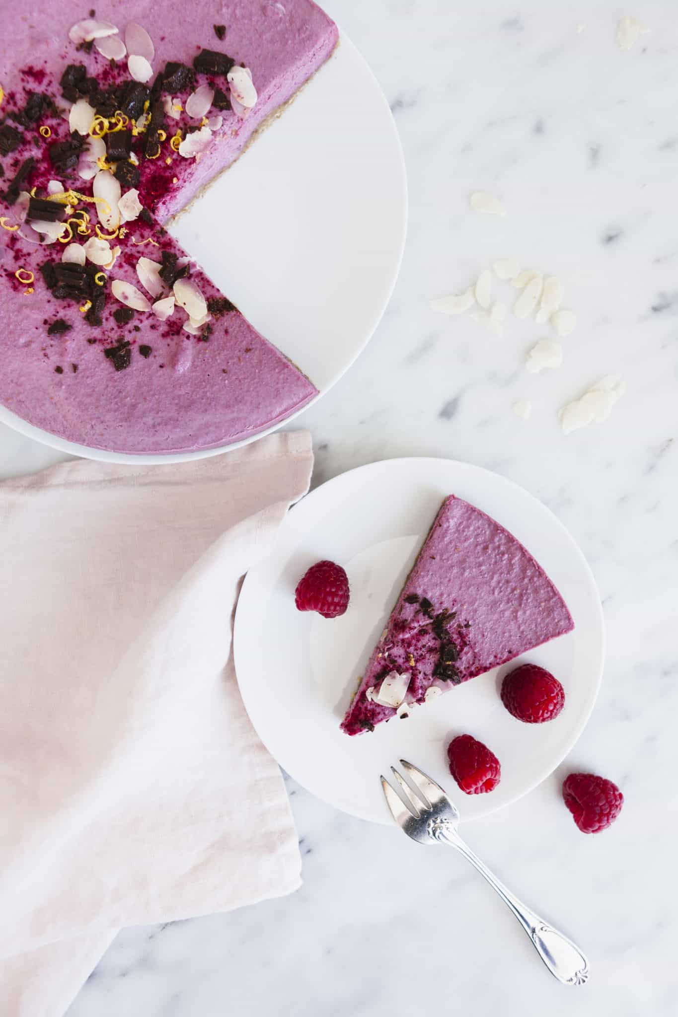 Proef onze lekkere vegan frambozentaart. Deze plantaardige cheesecake bevat framboos en een vleugje citroen. De bodem is gemaakt van amandelmeel, dadels en cashewnoten.