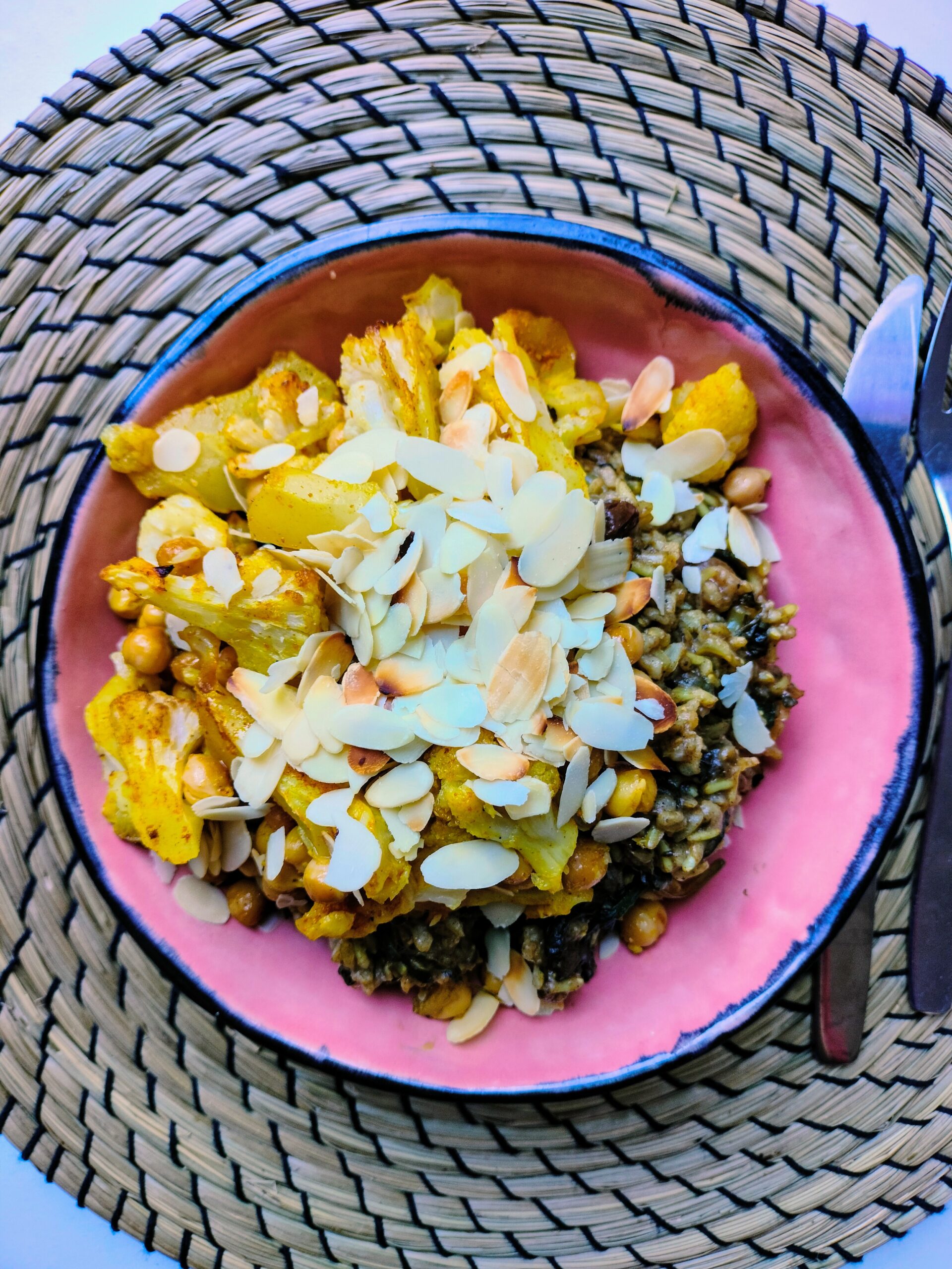 Juweelrijst met geroosterde bloemkool en kikkererwten