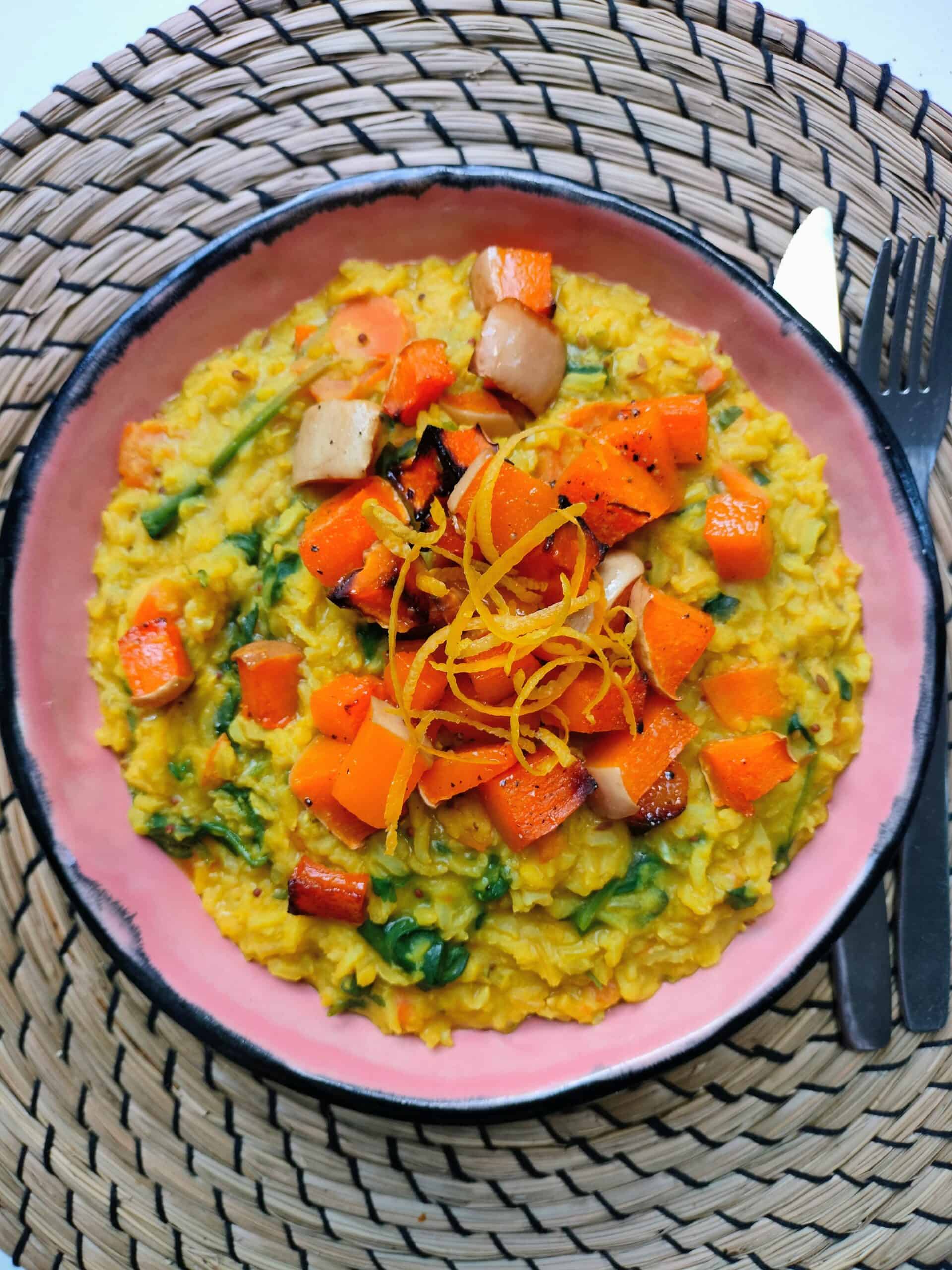 Een ayurvedische klassieker op basis van rijst en mungbonen, met spinazie, wortel en geroosterde pompoen, en afgewerkt met citroen en koriander. Ideaal om op te warmen na een stevige herfstwandeling.