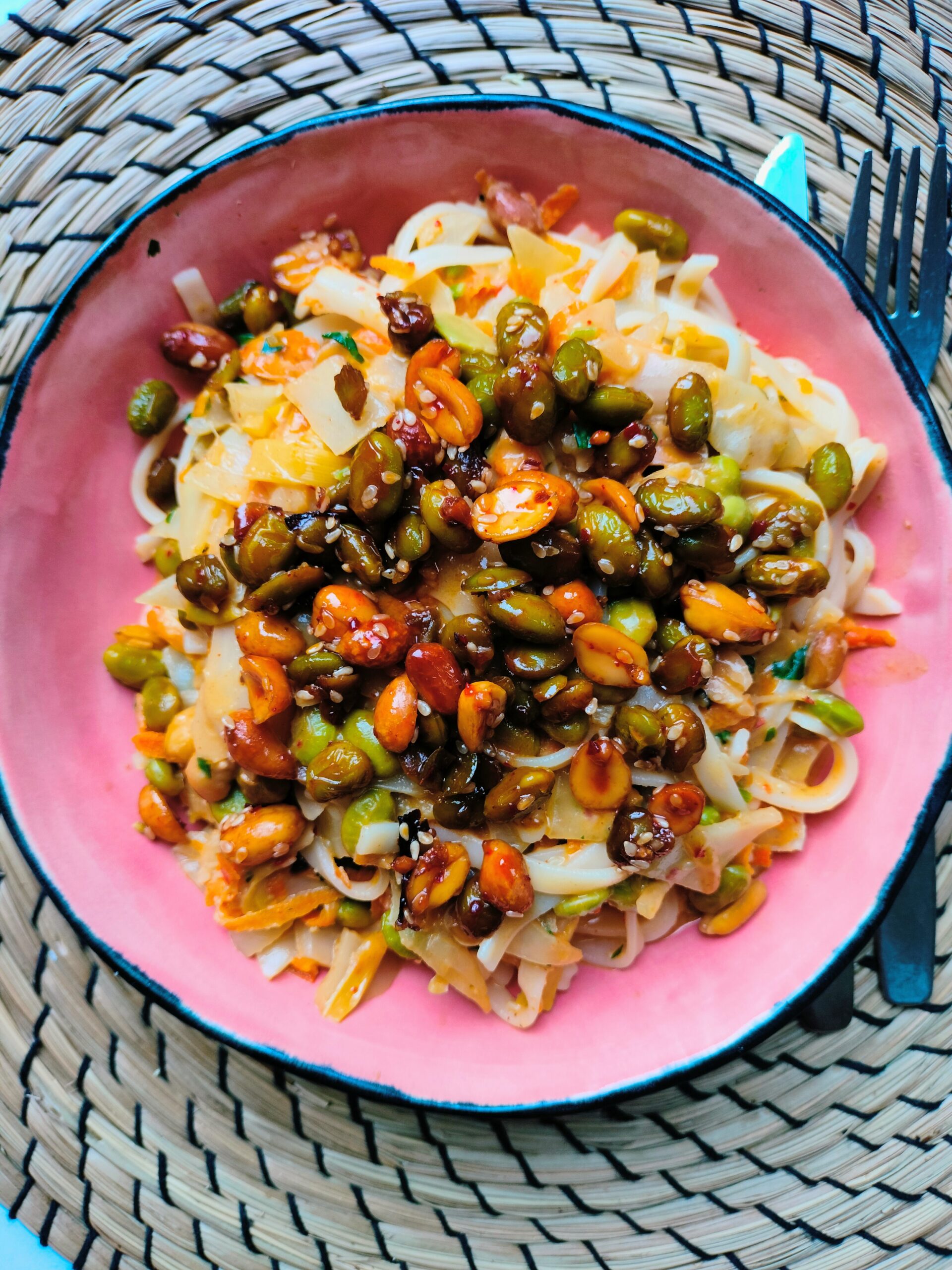 Noedels met rode curry, sticky edamame en crunchy pindanoten