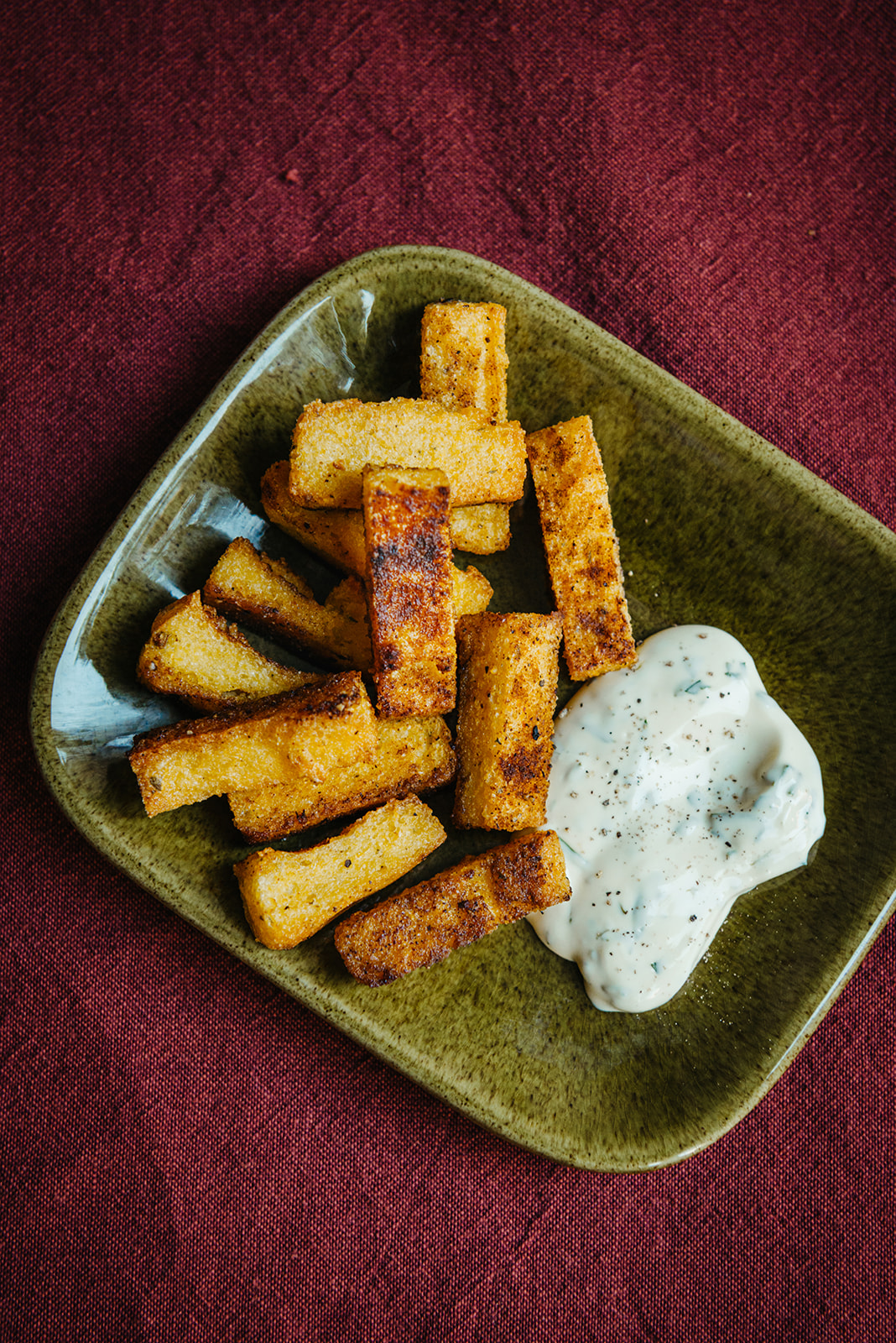 Vorig jaar voor het eerst op het menu gezet, en die beviel jullie zo goed, dat het een vaste waarde is geworden: de heerlijk knapperige polentafrietjes met bieslookveganaise.