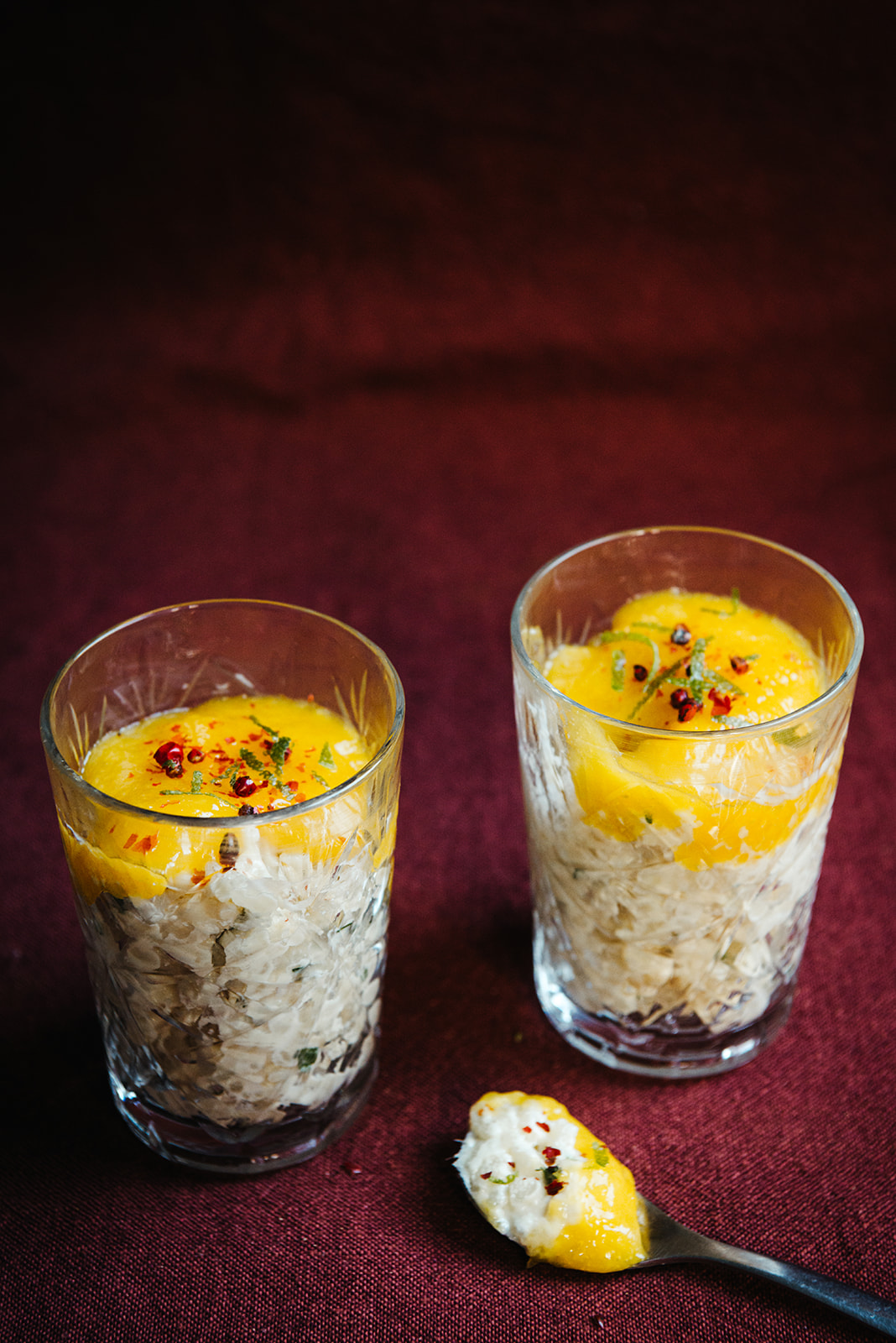Een romige rijstpap met frisse toetsen van munt en limoen, afgewerkt met mangocoulis en roze peper.