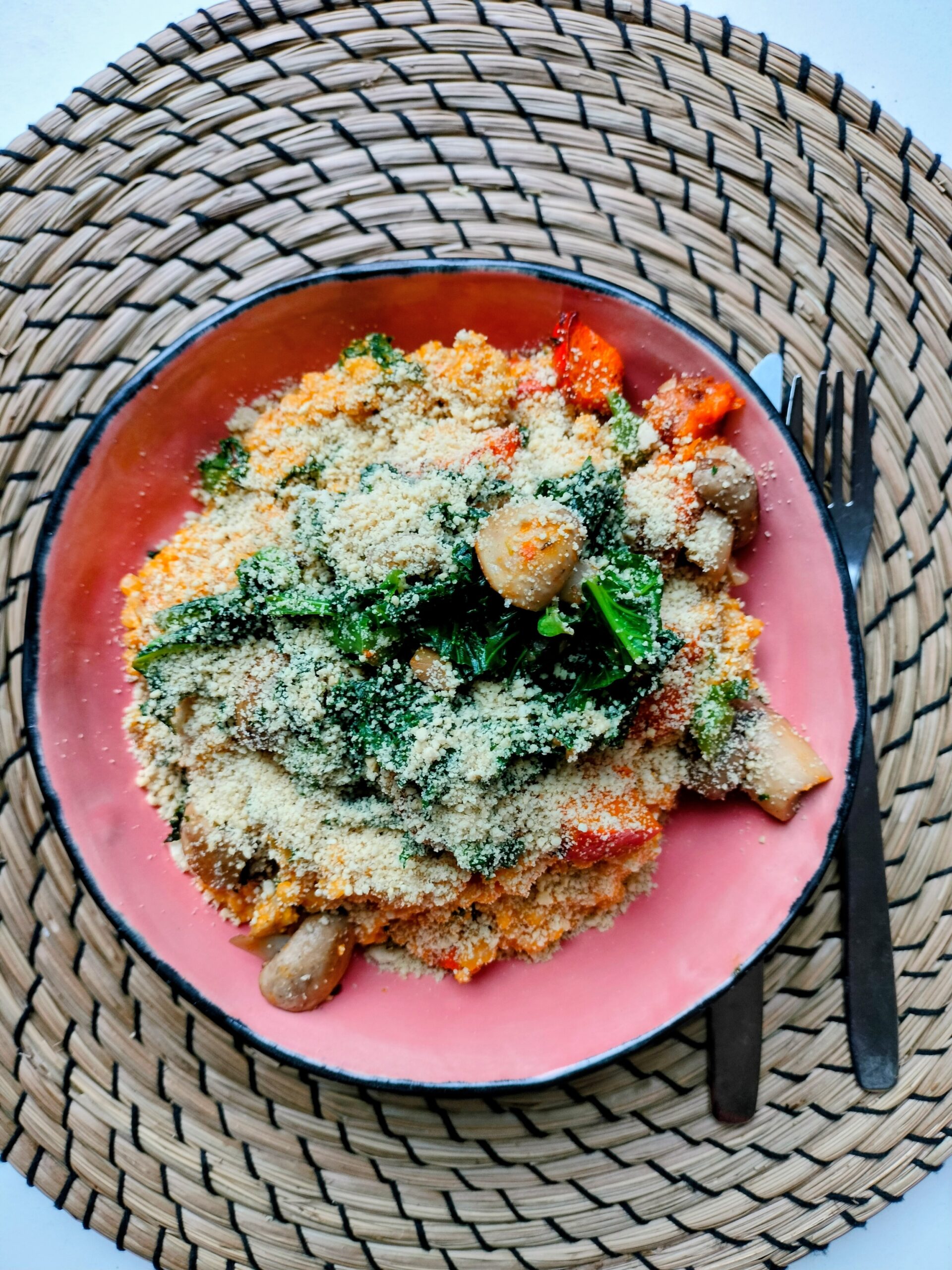 Suggestie van de week: Parelcouscous met pompoencrème, champignons en boerenkool